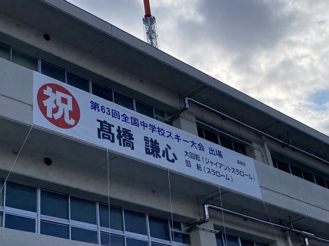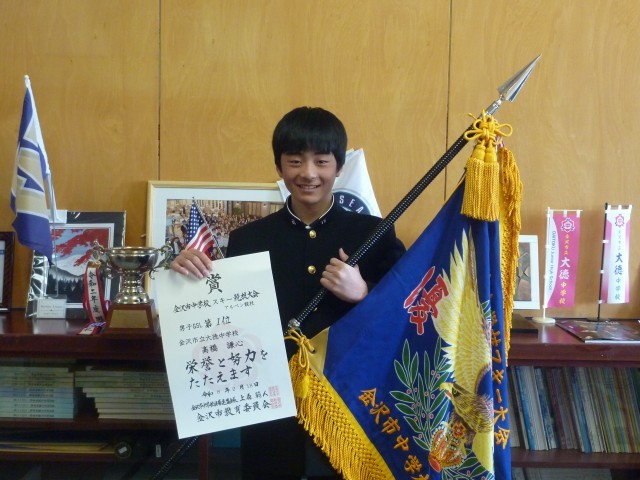 2月18日(水)白峰アルペン競技場にて「第71回金沢市中学校スキー大会」が行われ、髙橋謙心さん(1年)が、歴史と伝統のある大会で、見事、優勝の栄冠に輝きました。髙橋さんは、2月3日(火)から6日(金)長野県野沢温泉スキー場で行われた「全国中学校スキー大会」でも、大回転で86位、回転で55位の成績を収めています。本日〔2月19日(木)〕校長室へ結果報告に来てくれ、「将来は、オリンピック選手として活躍したい」と話してくれました。これからの活躍に大いに期待しています。