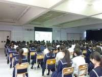 本校ではアメリカ合衆国シアトルのイーグルスタッフミドルスクールと交流を行っており、3年ぶりに訪問を受けました。この日は水引作りやけん玉などの日本文化の体験を行いました。明日は生徒たちと一緒に授業に参加する予定です。