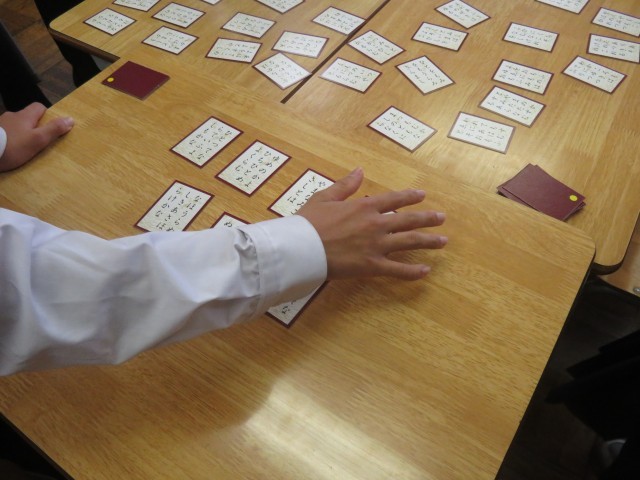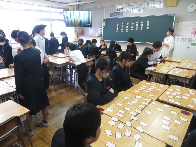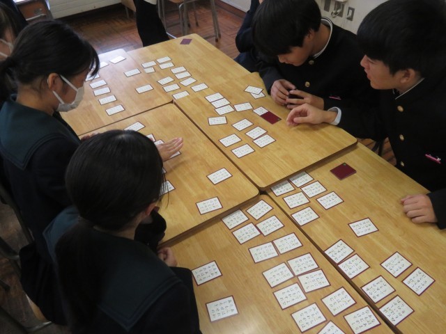百人一首(2年生) 公開日 2025/11/21 更新日 2025/11/21 学校のようす 11月21日(金)2年生の国語の授業では、百人一首が行われています。百人一首とは、百人の歌人の和歌を一首ずつ選んでまとめたもので、藤原定家が選んだとされる「小倉百人一首」が有名です。(※国語の教科書より)1月には、2年リーダー会の主催で、クラス対抗の百人一首大会が予定されています。上の句の最初の一字が読まれると、下の句が分かるのは・・・確か・・・。