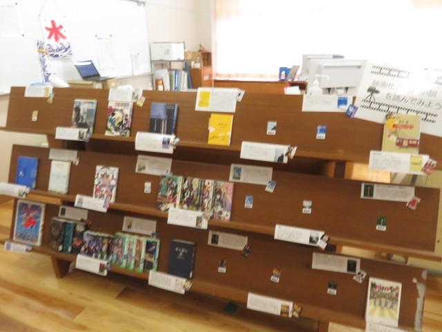 ライブラリーで本を借りて返却するときに、その本の「本のタイトル」「好きな一文」等を小さな紙に書いて提出します。その小さな紙は、ライブラリー前の模造紙に貼られ、おすすめの本として紹介されるという流れです。