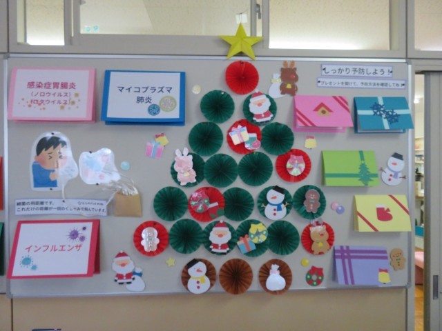 生徒に感染症対策について関心を持ってもらうため、クリスマス風の掲示物になっています。