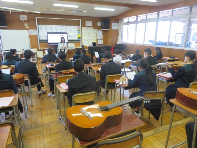 音楽科の授業は、楽器の単元に入り、生徒はギターを使って曲の演奏にチャレンジしています。