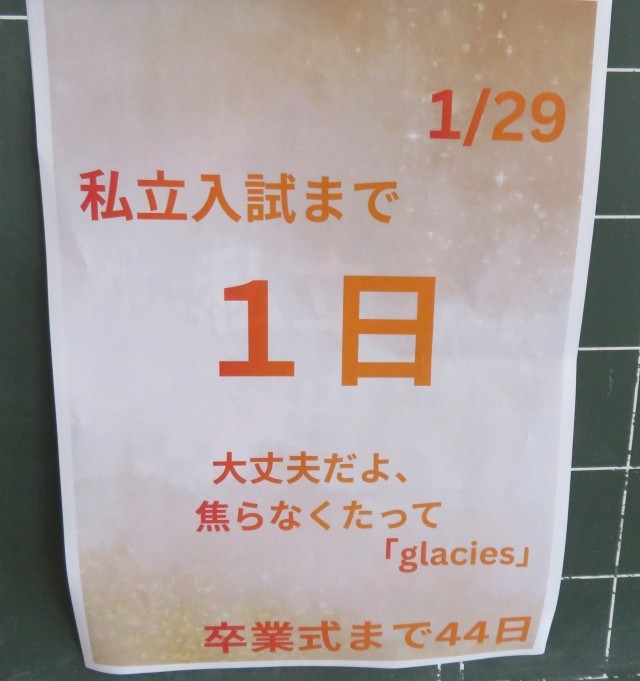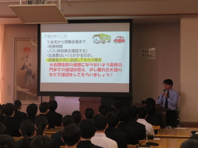 私立入試の事前指導 公開日 2026/01/29 更新日 2026/01/29 学校のようす 1月29日(木)いよいよ私立高校入試となります。事前指導では、緊張感を持って校長先生の激励や担当の先生の諸注意を聞く様子が見られました。明日は、積雪が心配されます。時間に余裕を持って行動するようにしましょう。いつもの自分、平常心で頑張ってきてほしいと思います。