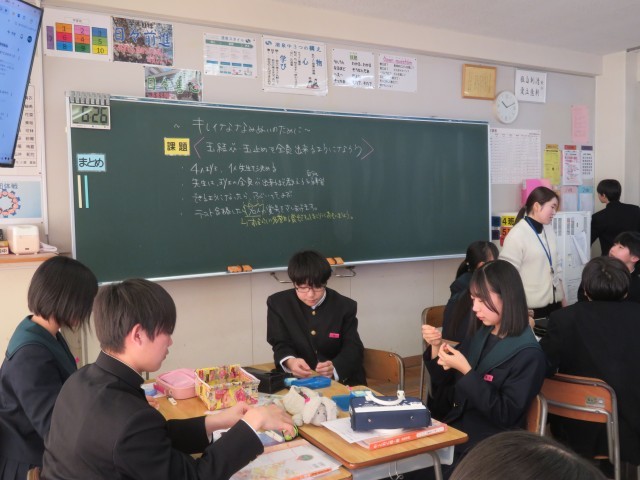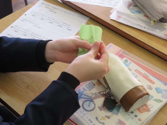 同じく2年生の家庭科の時間では、裁縫の授業で結び玉をつくるための実技指導が行われていました。